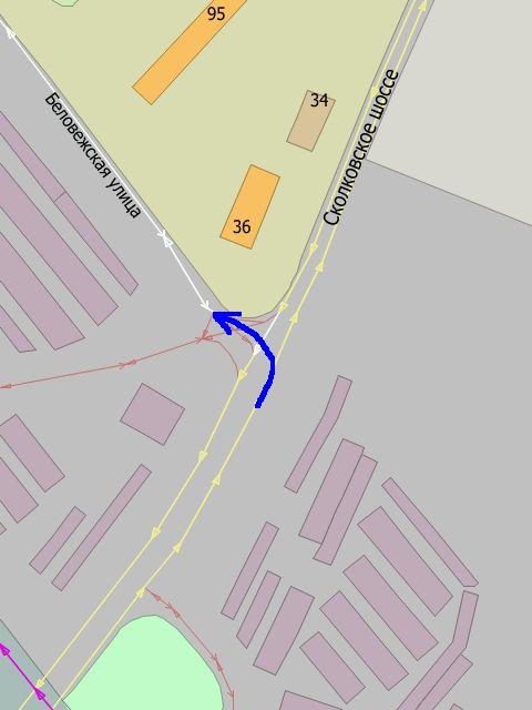 Есть левый поворот со Сколковского шоссе на Беловежскую улицу.
