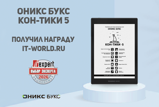 ОНИКС БУКС Кон-Тики 5 получил награду it-world.ru[вторник, 10 февраля 2026 г, 11:37]Ридер ОНИКС БУКС Кон-Тики 5 недавно поступил в продажу, но уже успел получить награду «Выбор эксперта» от редакции it-world.ru.