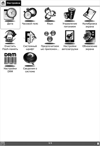 Меню настройки параметров, помимо привычных функций установки времени, часового пояса и выбора языка интерфейса, включает функции управления питанием, калибровки сенсорного экрана, форматирования Flash памяти, выбора системного шрифта, настройки режима автозагрузки, предпочитаемых приложений и обновления экрана. Кроме этого, появилась функция работы с книгами, имеющими DRM защиту.