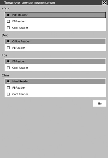 Отдельно остановимся на настройке предпочитаемых приложений, которая позволяет выбрать приложение для работы с тем или иным форматом. На мой взгляд, очень грамотное дополнение, позволяющее сделать работу с букридером еще более удобной и эффективной.