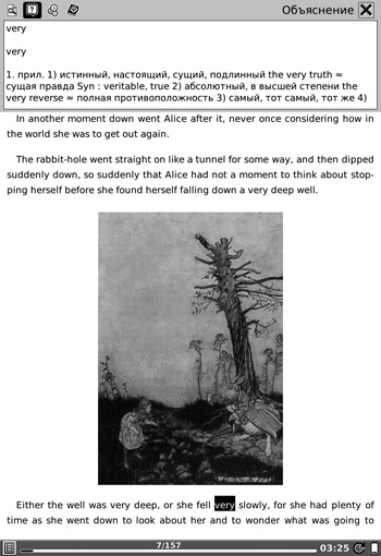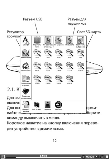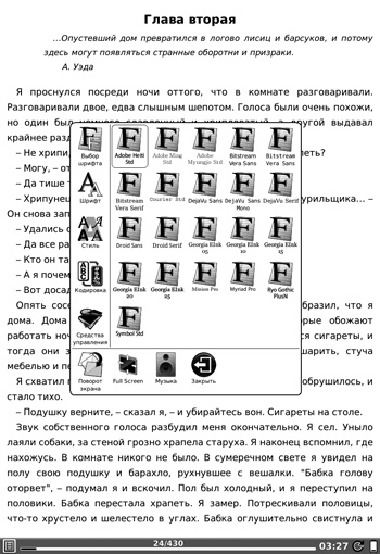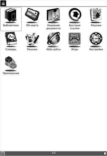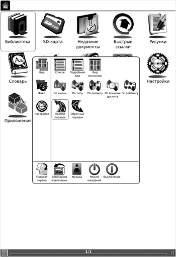 Главное меню включает несколько инструментов для работы с книгами. Здесь используется раздельное хранение книг в библиотеке (внутренней памяти) и на карте памяти. Это очень удобно и не позволяет потеряться в своей библиотеке. Если же вам больше нравится искать книги в общем списке, то можете воспользоваться двумя дополнительными инструментами, в которых хранятся ссылки на недавно открытые книги (Недавние документы) и часто используемые книги (Быстрые ссылки). Помимо инструментов для работы с книгами, главное меню включает утилиту для написания заметок, создания рисунков, доступа в интернет, встроенный словарь, пару полезных приложений и даже одну игру. Изюминкой пользовательского интерфейса можно считать гибкость в настройке представления тех или иных элементов. Используя контекстное меню, пользователь может выбрать вариант отображения иконок, режим сортировки, открыть меню настройки параметров, повернуть экран, открыть фоновое приложение для проигрывания музыки, перевести букридер в режим сна и выключить устройство.