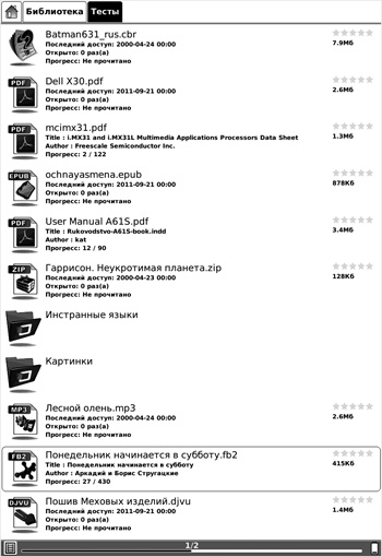 Возможность выбора варианта отображения иконок будет особенно актуальна для файлового браузера. В зависимости от личных предпочтений, пользователь может выбрать отображение простого списка, режим отображения эскизов и режим полного списка с отображением формата, тегов (название, автор и др.), числа прочитанных страниц и рейтинга книги в вашей библиотеке.